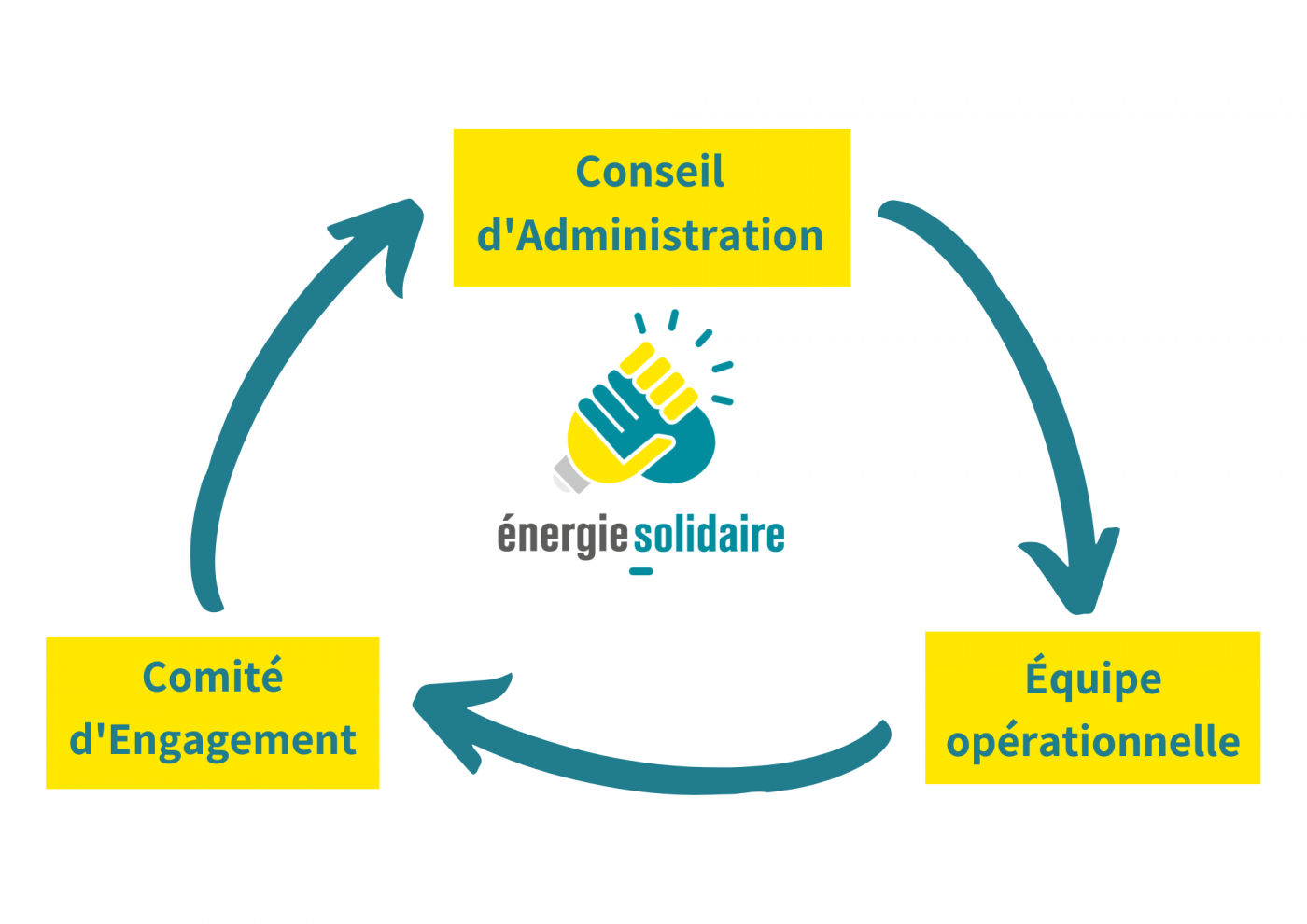 Ainsi chez Énergie Solidaire, trois organes composent la Gouvernance Partagée : le Comité d’Engagement, le Conseil d’Administration, et l’équipe opérationnelle salariée.